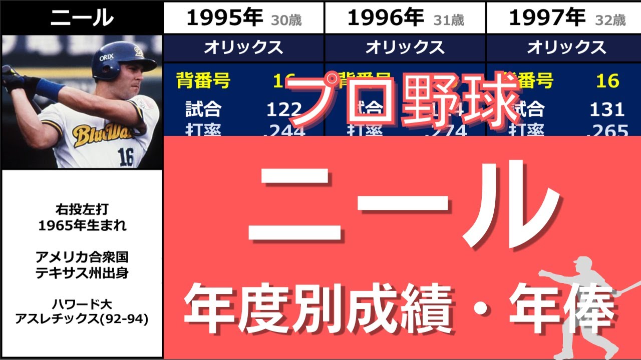 1995年2月1日にオリックス・ブルーウェーブに入団した、ニール選手のプロ野球での成績です。