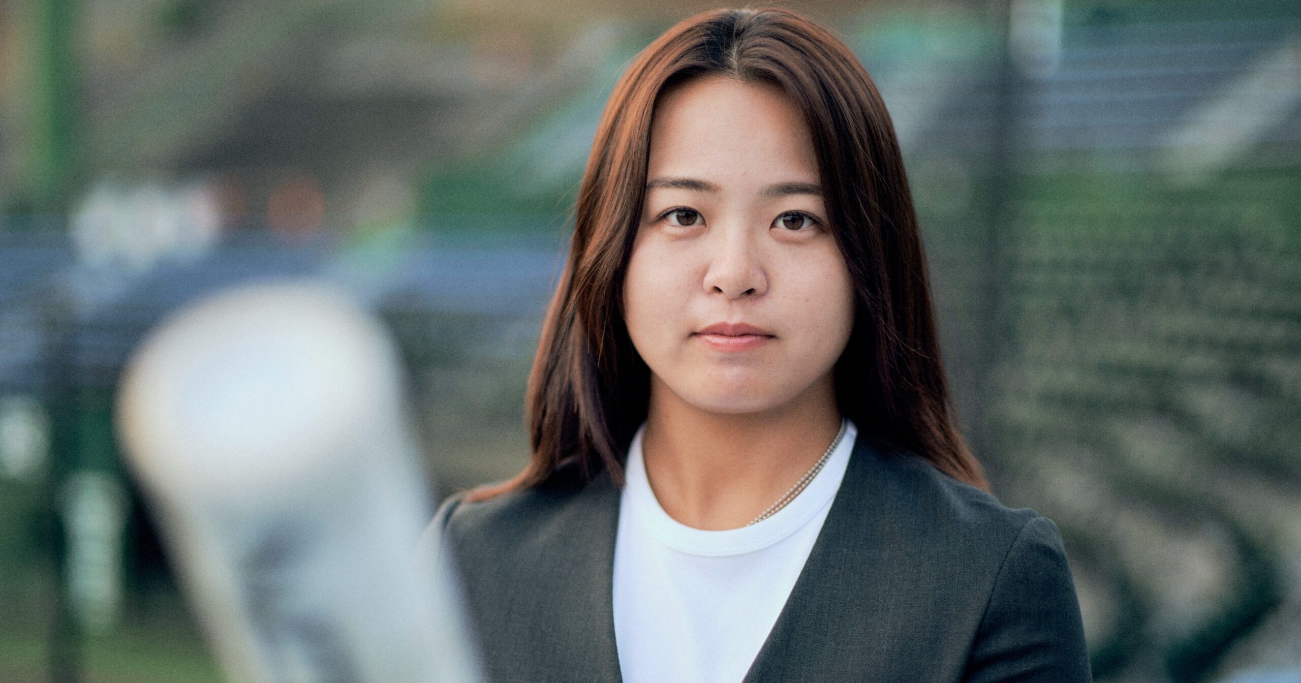 カメラのレンズをまっすぐに見つめるまなざしに、力が宿る。12月上旬、島野愛友利は深いグリーンのスーツを華麗に着こなし、読売ジャイアンツ球場での取材の場に現れた。