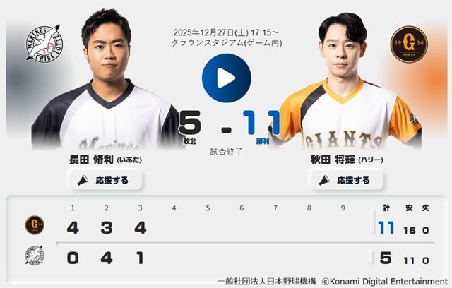コナミデジタルエンタテインメントは、日本野球機構(NPB)公認のプロ野球eスポーツリーグ「プロスピA プロリーグ」2025シーズン supported by TIR GAMING(通称:スピリーグ)の最終戦「e日本シリーズ」を12月27日にグランキューブ大阪で開催し、読売ジャイアンツが3勝0敗で千葉ロッテマリーンズを下し、初の日本一に輝いたことを発表した。