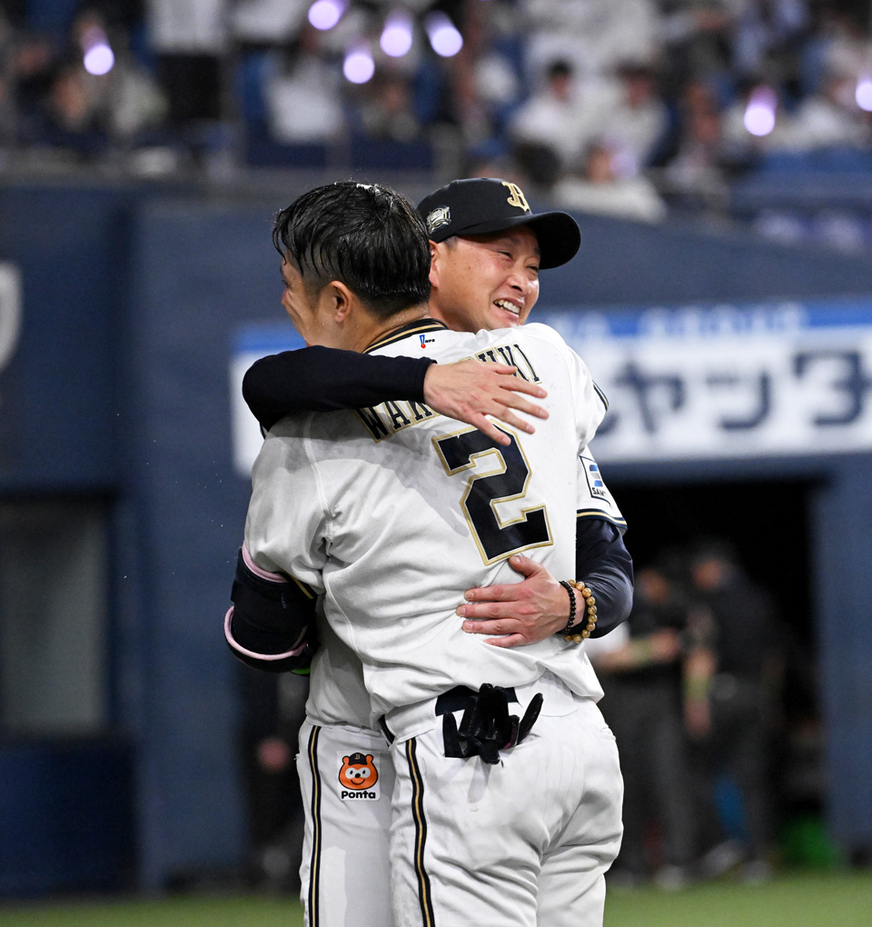 写真:開幕戦、サヨナラ打を放った若月選手と抱擁を交わす岸田監督(3月28日・京セラドーム大阪)