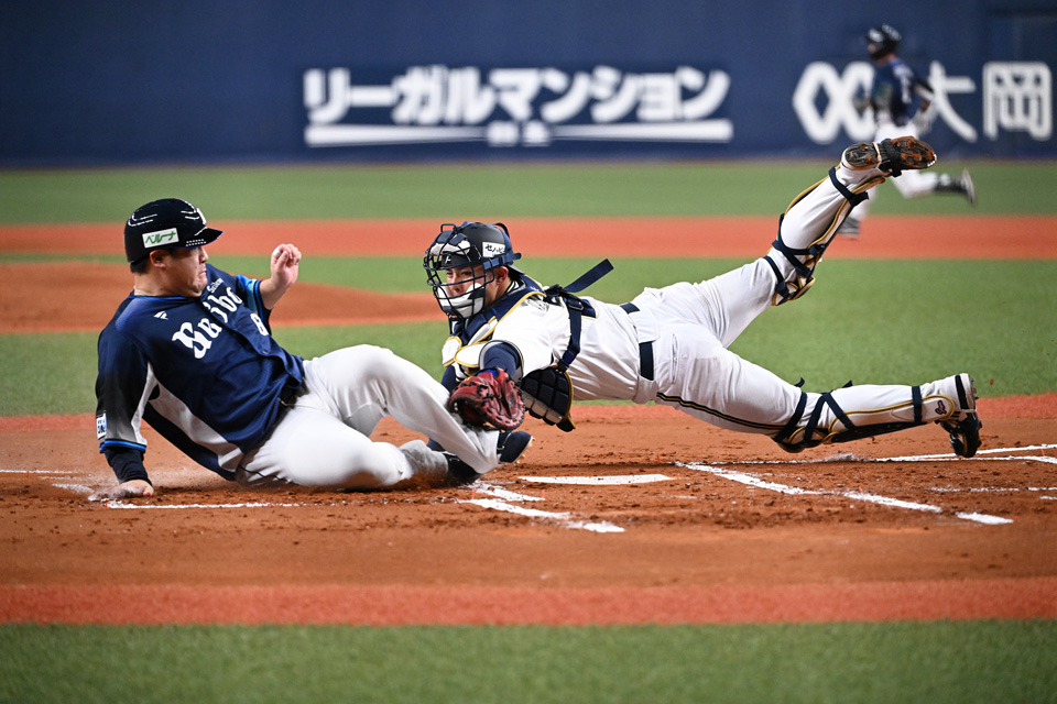 最後に紹介するのは、クロスプレーの1枚。4月16日、初回、埼玉西武ライオンズの攻撃。二死二塁から、レフト方向に打球が飛び、二塁ランナーが本塁を狙って走る。ここで、左翼手の西川龍馬選手が好返球。ボールは今シーズン、ゴールデン・グラブ賞を獲得した若月選手のもとへ渡った。