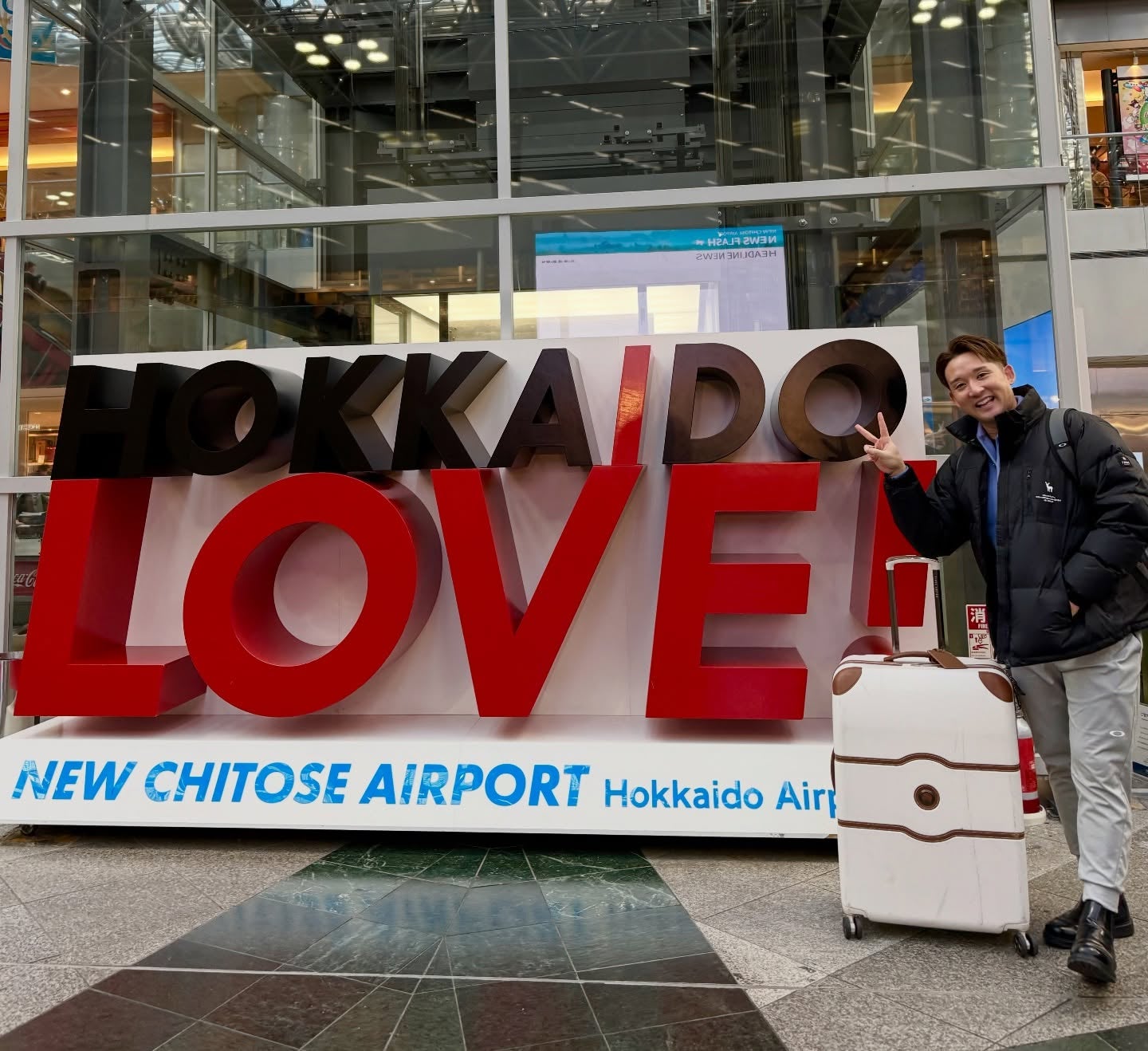 新千歳空港に設置された「HOKKAIDO LOVE」のモニュメント前で撮影された一枚には、スーツケースを手に笑顔を見せる杉谷の姿が収められている。