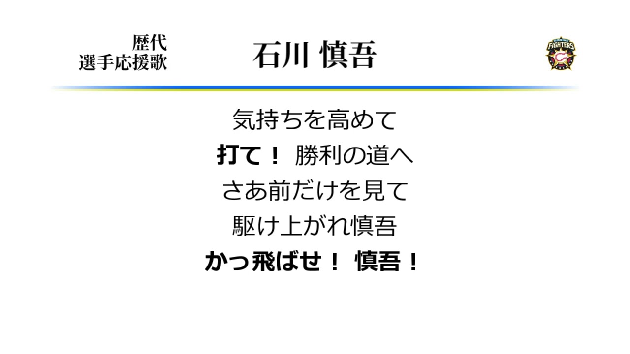 石川慎吾選手の日本ハム時代の応援歌です。 さすがに石川が現役を続けている間、ハムでこの応援歌の流用はしづらいでしょう。 とはいえ、たった1年しか使われていないというのも何とももったいない。 Hokkaido Nippon-Ham Fighters (Baseball Team)Shingo Ishikawa (Baseball Player)Yomiuri Giantsなんぶふじ北海道日本ハムファイターズ応援歌石川慎吾読売ジャイアンツ NPBHUB.COM | The Fanbase of Nippon Baseball & Nippon Professional Baseball