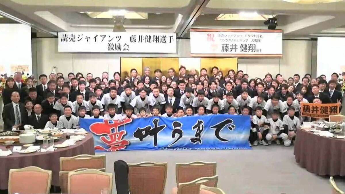 去年(2025年)のプロ野球ドラフト会議で巨人から6位指名された藤井健翔選手の激励会が、きょう(3日)故郷の倉敷市で開かれました。