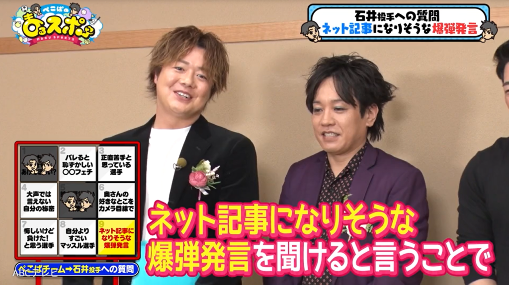 なお、石井投手ら出演者の秘密が明らかになったゲーム対決は、2026年1月4日に放送されたスポーツバラエティ番組『ぺこぱのまるスポ』(ABCテレビ)で行われた。