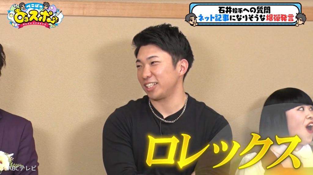 そんな石井投手は、ストラックアウト形式でトークテーマが決まるゲームに挑戦。「ネット記事になりそうな爆弾発言」というテーマで、「まあちょっと、自分のご褒美じゃないですけど、時計を今年買わせてもらいまして。シーズンお疲れ様ということで」と語った。