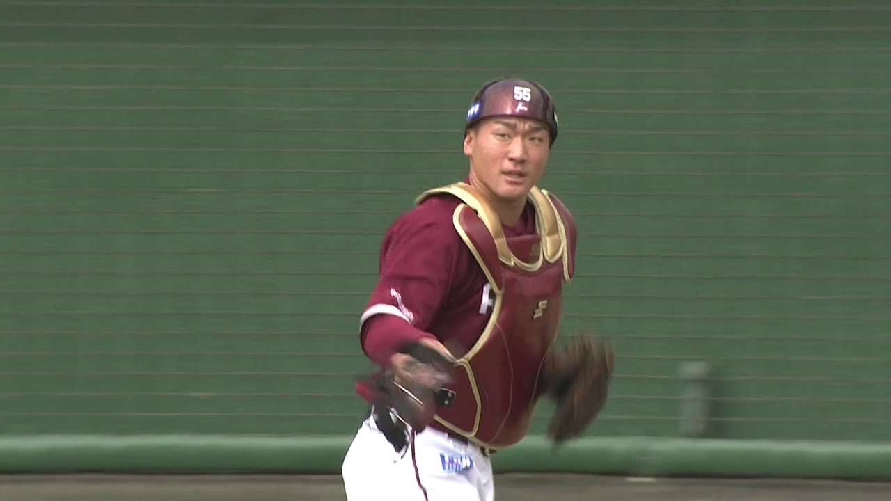 2回裏2死一塁、遠藤成が二塁盗塁を試みるも、楽天・安田悠馬の強肩が炸裂し盗塁を阻止!