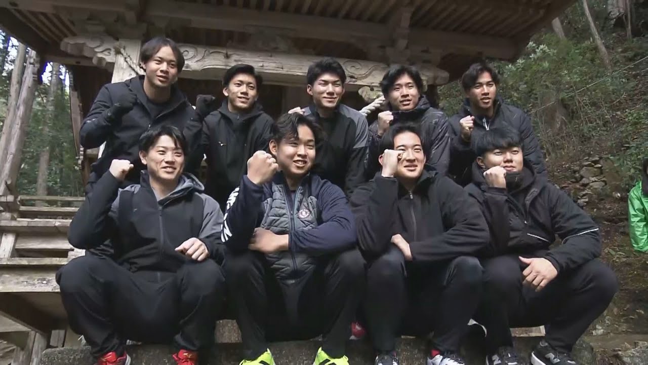 カープのルーキー9人が広島市佐伯区の湯ノ山明神を参拝し、プロでの活躍を祈願しました。