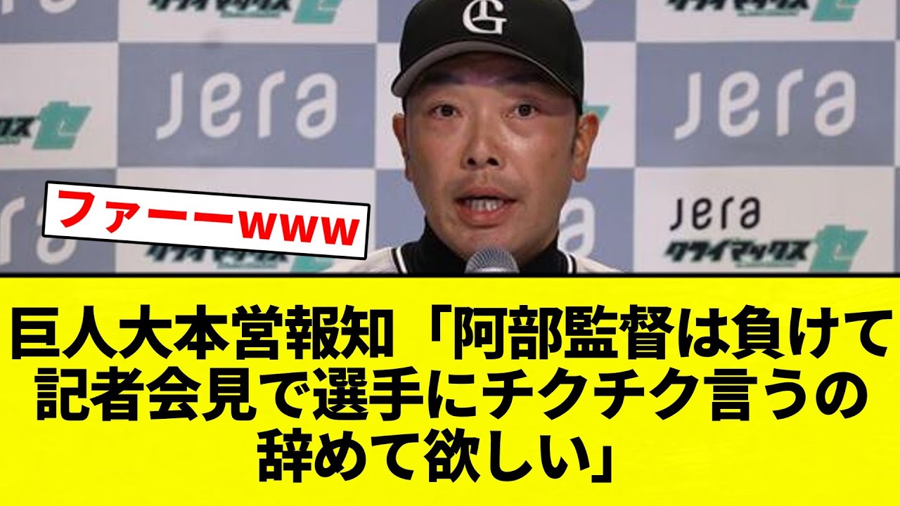 【BEA】巨人大本営報知「阿部監督は負けて記者会見で選手にチクチク言うの辞めて欲しい」【プロ野球反応集】【2chスレ】【なんG】