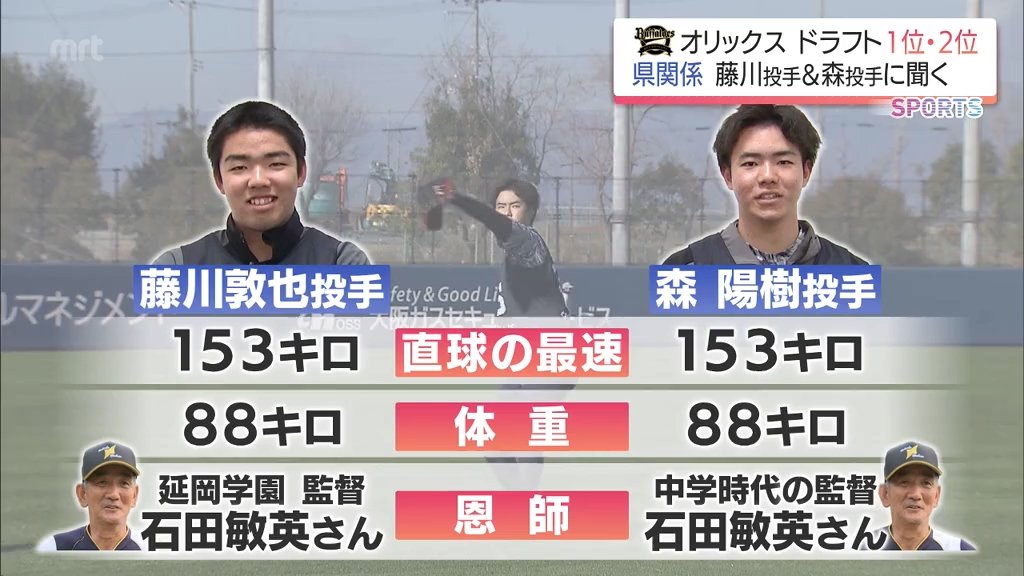 プロ野球、オリックスに入団したドラフト1位・2位コンビ、延岡学園高校の藤川敦也投手と、延岡市出身の森 陽樹 投手に注目します。