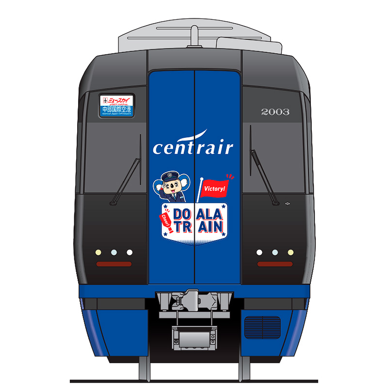 通常のミュースカイの配色を反転させた「ブルーミュースカイ」に,名鉄の制服を着用した「名鉄駅員ドアラ」や,メガホンを手に全力で応援する「ドアラ」の姿を配置した特別なラッピングデザインを施します.