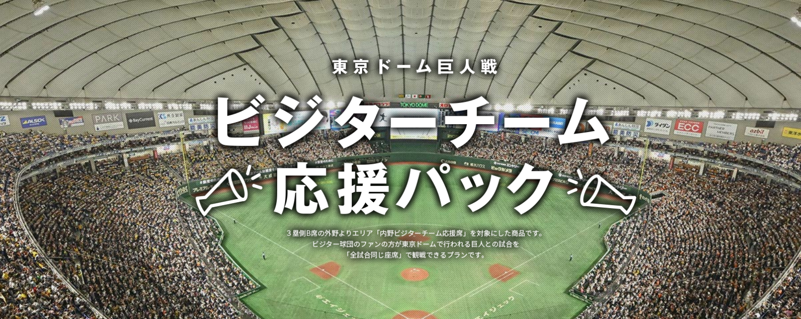 「ビジターチーム応援パック」は、東京ドームで行われるジャイアンツ公式戦において、対戦球団別に全試合を同じ座席で観戦できるプラン。座席エリアには、内野ビジターチーム応援席A49ブロックと指定席B(阪神戦のみ)、A48、B48ブロックが用意されている。各プランの料金と日程は以下の通り。