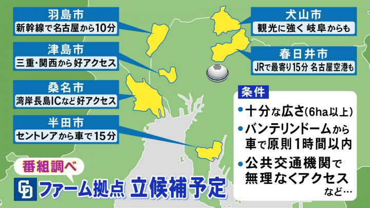 こうした流れの中、ドラゴンズの新たな2軍拠点をめぐっても動きが活発化しています。番組で調べたところ、犬山市(観光に強く岐阜からも好アクセス)、春日井市(バンテリンドーム最寄り駅からJRで15分、名古屋空港からも好アクセス)、津島市(三重・関西からも好アクセス)、半田市(セントレアから車で15分)、岐阜・羽島市(新幹線で名古屋から10分)などが立候補しています。