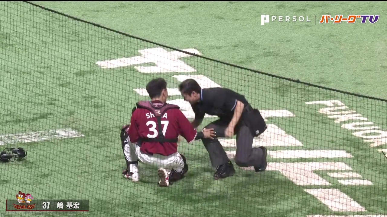 後方に打ちあがった飛球を追い掛け、嶋基宏が球審を突き飛ばしてしまうが、捕球後にすかさずフォロー。できる男は違います。