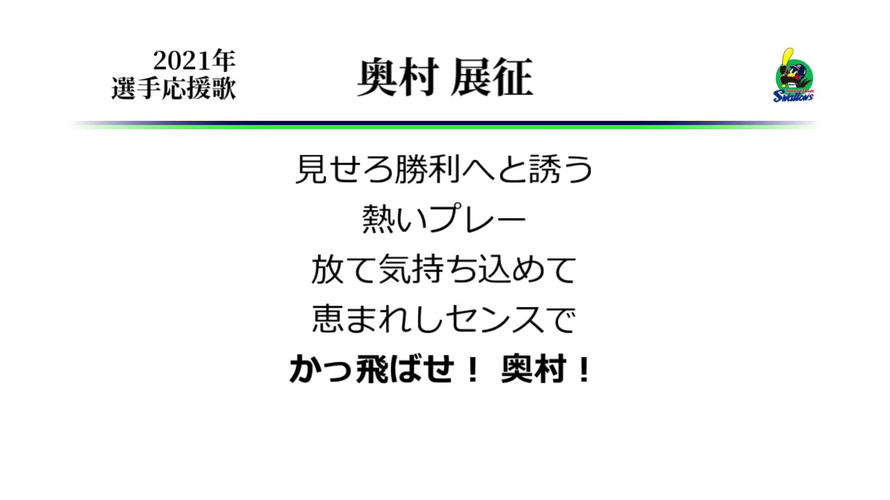 (訂正 : 0:15~のコメント ×「人的保障」→○「人的補償」 お詫びして訂正いたします) ヤクルト奥村選手の応援歌です。 この応援歌も作られてから今年で早4年目になるんですね。 新応援歌B9で取り上げたのがつい最近の話のよう。 Nobuyuki Okumura (Baseball Player)Tokyo Yakult SwallowsTokyo Yakult Swallows (Baseball Team)なんぶふじ奥村展征応援歌東京ヤクルトスワローズ NPBHUB.COM | The Fanbase of Nippon Baseball & Nippon Professional Baseball