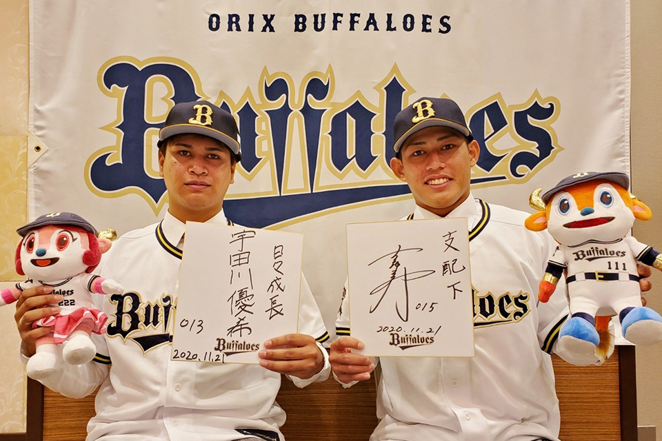 写真:2020年11月21日、仮契約を終えた宇田川投手㊧と佐野スカウト㊨