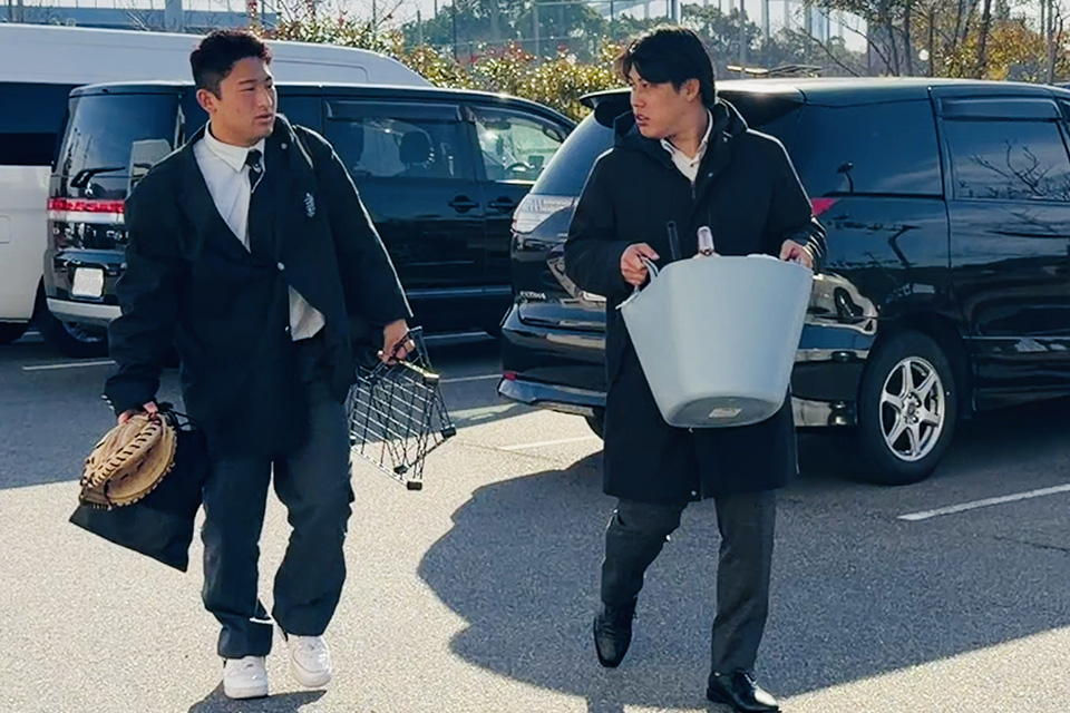 車のトランクから段ボールやキャリーケースがひとつずつ地面に下ろされていく。「あとはもう持っていくものはない?」「じゃあ、こっちは俺が持つよ」「お。そのグローブ、新しいやつ?」。新入団選手の入寮日、佐野如一スカウトは、バファローズの選手寮「青濤館」の玄関前で、荷物を両手に新人選手の少し先を歩いた。