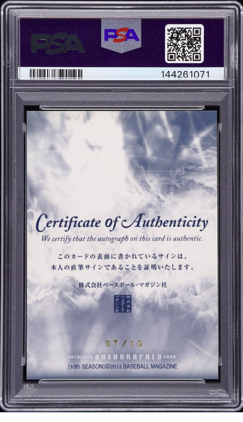 10枚限定のルーキーサインカードはPSAで「GEM MT 10」の満点のグレーディング評価を受けている。このカード自体も市場に出現することが少なく、PSAによると「GEM MT 10」は現時点で、世界に1枚しかない、という。サインも現在とは違う初期の形という希少性もある。