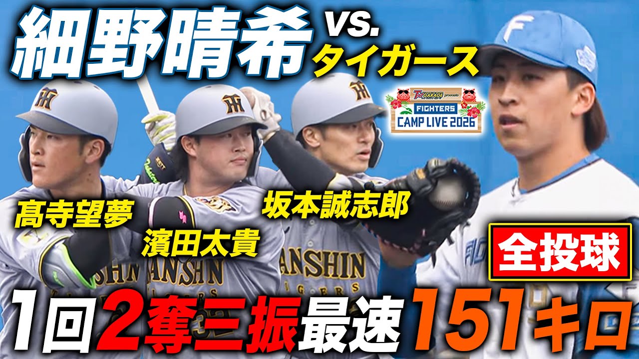 細野晴希vsタイガース練習試合 1回2奪三振「力感がなくなった」全投球<2/8ファイターズ春季キャンプ2026>