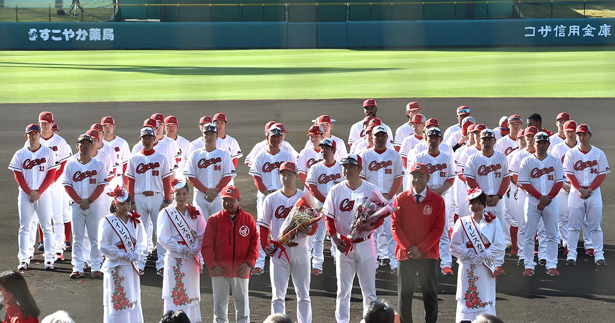 プロ野球の広島は14日、沖縄市のコザしんきんスタジアムで2次キャンプをスタートした。球場で歓迎式が行われ、新井貴浩監督と島内颯太郎選手会長に花束や果実などが手渡された。沖縄キャンプは25日まで。
