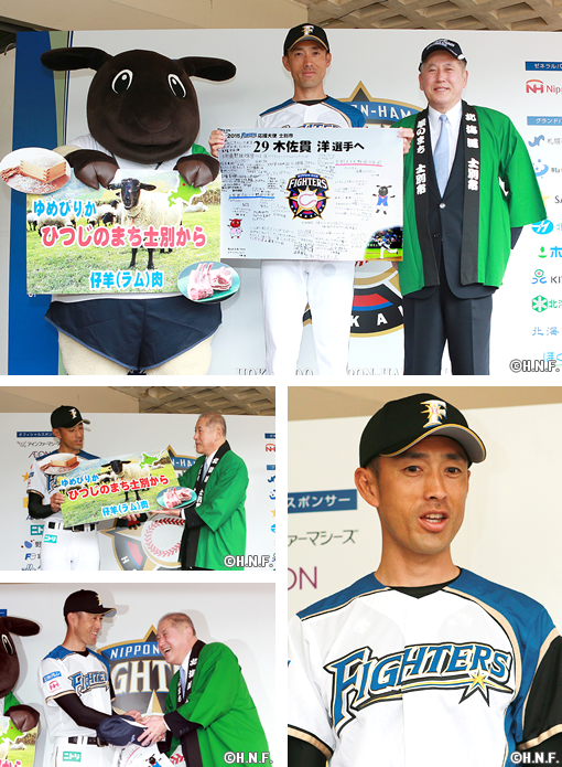 士別市は上川振興局のほぼ中央に位置し、市の東部には一級河川である天塩川の水源、天塩岳がそびえ立つ自然豊かな地域です。そのため農業、畜産業が盛んで、中でも市内で約1,200頭を飼養しているめん羊が有名です。牧野市長からは士別市産のラム肉とお米のゆめぴりかの目録、そして士別市の野球少年団の子ども達からの寄せられたメッセージボードをいただきました。木佐貫投手は「今年は未年ですし、羊を沢山食べて日本一になりたいです。プライベートでは宗谷本線に乗って士別まで遊びに行きたいです」と意気込みを語りました。