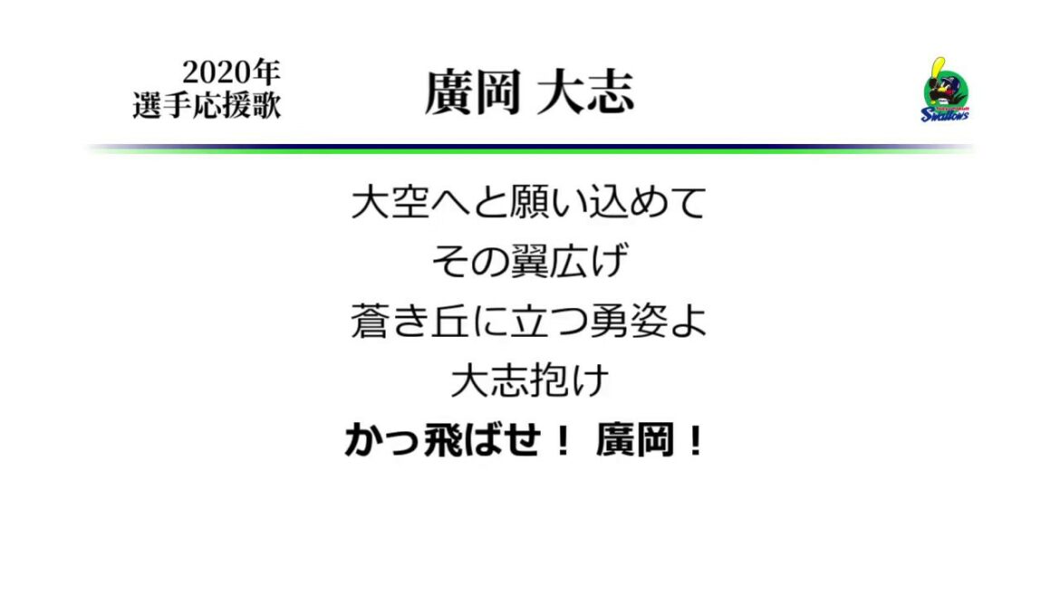 ヤクルト廣岡選手の応援歌です。 ’19の開幕連続無安打記録については、ヒットが1本出た後の 打率が.024とかなっているほうがよりグロさを感じましたが、 何とかその後持ち直したことで、この応援歌が不吉のテーマ扱いされずに済みそうなのは本当によかったです。 Yomiuri Giants廣岡大志応援歌読売ジャイアンツ NPBHUB.COM | The Fanbase of Nippon Baseball & Nippon Professional Baseball