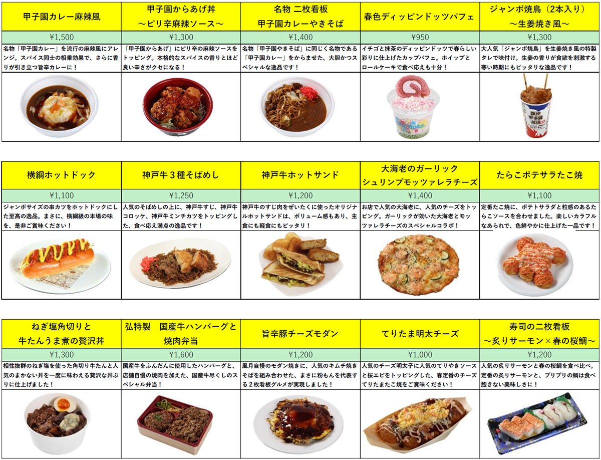 各店舗自慢の人気メニュー同士を掛け合わせたグルメから、春らしい季節の食材や彩りで仕上げたグルメまで、絶品グルメが盛り沢山!