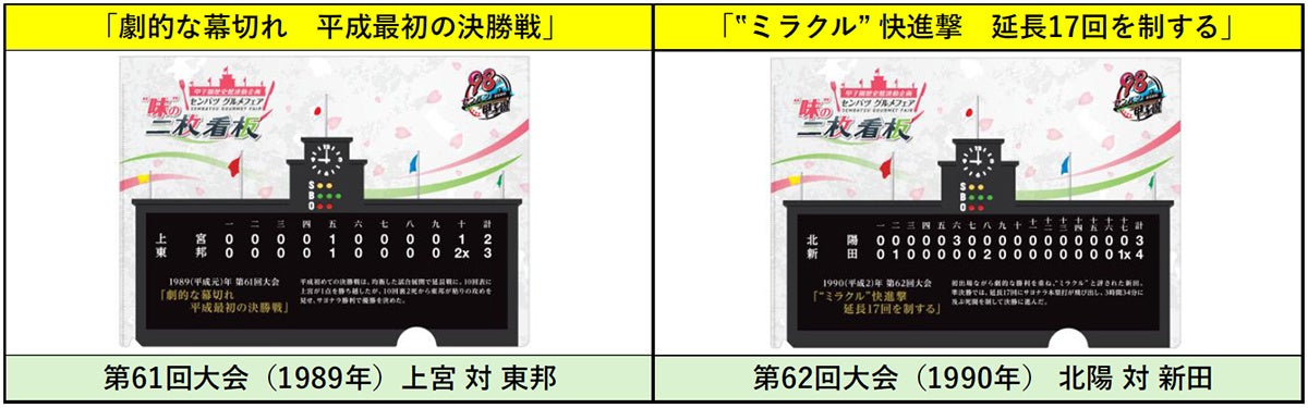 阪神甲子園球場内売店で、期間中に対象グルメを1商品ご購入ごとに、MBS「みんなの甲子園」の出演者の赤星憲広氏や、森本栄治アナウンサーや番組スタッフが選ぶ『心に残るセンバツ名勝負 9選』のスコアボードがデザインされた「春の名勝負クリアファイル(全9種)」のうち、1枚をプレゼントします。