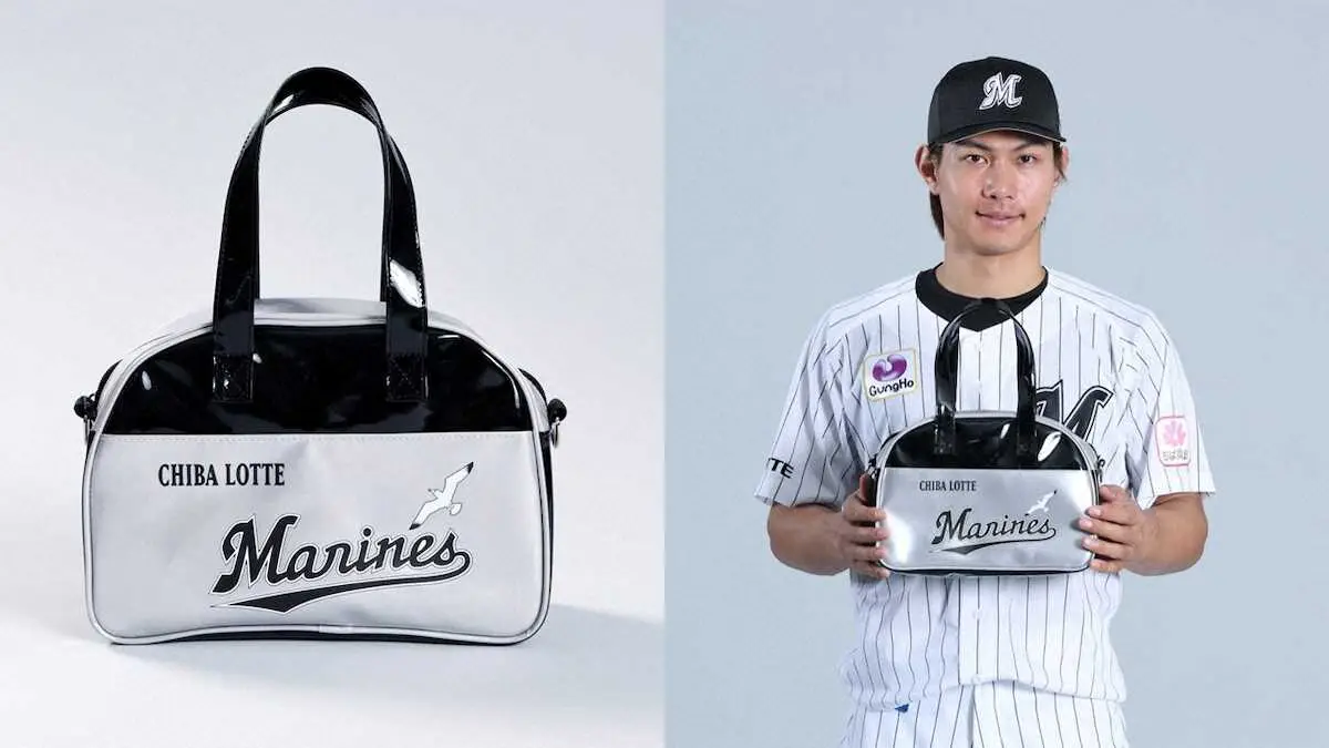 4月5日のソフトバンク戦で販売されるグッズ付きチケットでの「エナメルミニショルダー」とロッテ・藤原(球団提供)