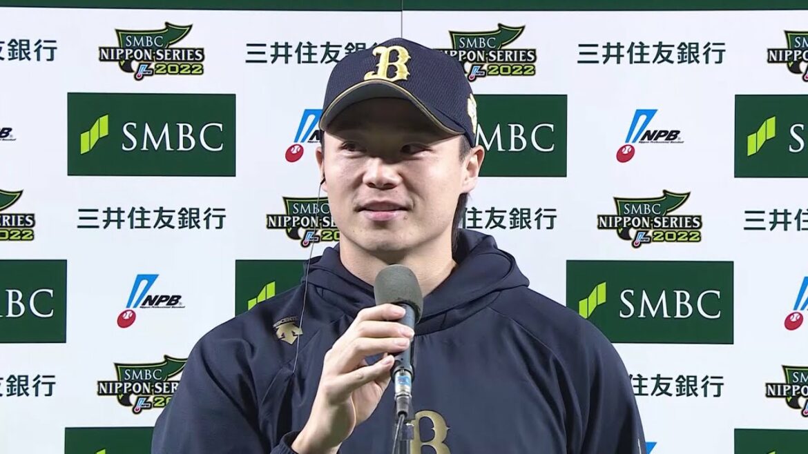 2022年10月29日(土)に明治神宮野球場で行われた「SMBC日本シリーズ2022」第6戦のヒーローインタビューは5回1安打無失点で勝利投手となった山﨑福也投手