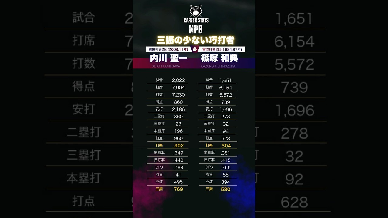 巧打者は三振が少ない例⚾️内川聖一&篠塚和典 三振は一つのアウトに過ぎない。 がやはり巧打者の三振は少ない。 試合数に対して試合数が少ない内川聖一&篠塚和典NPB通算成績を振り返ります! 歴代だと長嶋茂雄やイチロー、前田智徳も非常に三振の少ないバッターでした! Tokyo Yakult Swallows三振少ない内川聖一東京ヤクルトスワローズ篠塚和典 NPBHUB.COM | The Fanbase of Nippon Baseball & Nippon Professional Baseball