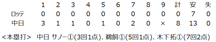 一方で、福永裕基がロッテ先発の石川柊太から、開始直後の初球に頭部死球。幸い大事には至らなかったようだが、ここまで打撃で結果を残してきただけに、非常に心配。今後に響くような影響が出ないことを、切に願う。