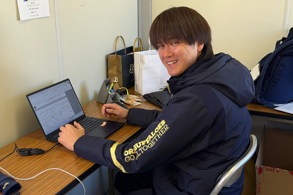 キャンプの一日は長い。日が暮れて選手たちが帰った後も片付けや翌日の準備がある。いつも最後のバスに乗って球場を後にする。それでも表情は明るい。「毎日新鮮ですし、やりがいも感じています」