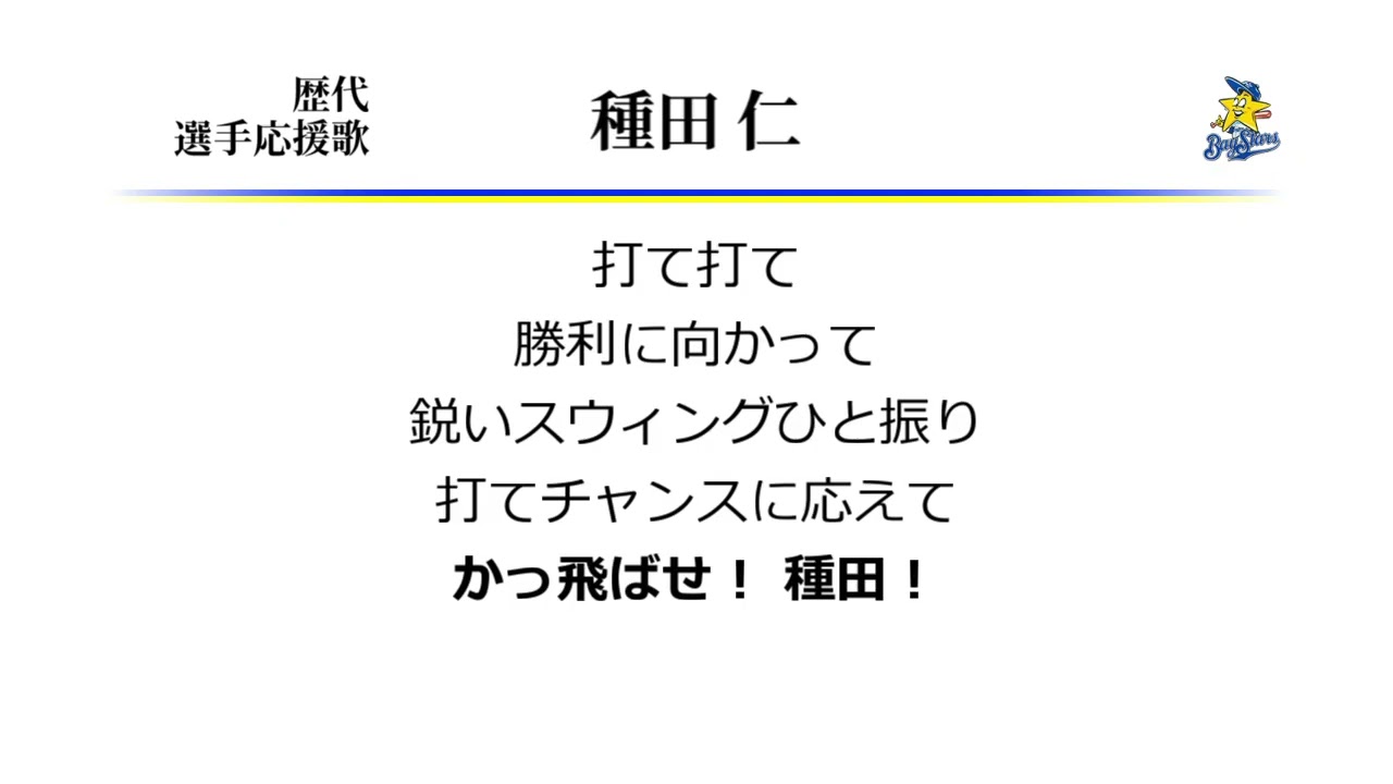 横浜ベイスターズ 種田仁 応援歌 [MIDI] 大洋横谷から流用された、横浜時代の種田の応援歌です。CD版ではありません。 1,2小節目のドラムパターンが「ドドン、ドン」となったのは、おそらく柳田流用後。 歌詞の「スウィング」表記も、種田使用当時の応援団HP上の記載にならったもの。 ○種田応援歌(西武時代)→https://youtu.be/gug3ZvNqXRU Hitoshi Taneda (Baseball Player)Tohoku Rakuten Golden EaglesYokohama BayStars (Baseball Team)なんぶふじ応援歌東北楽天ゴールデンイーグルス横浜ベイスターズ種田仁足立祐一 NPBHUB.COM | The Fanbase of Nippon Baseball & Nippon Professional Baseball