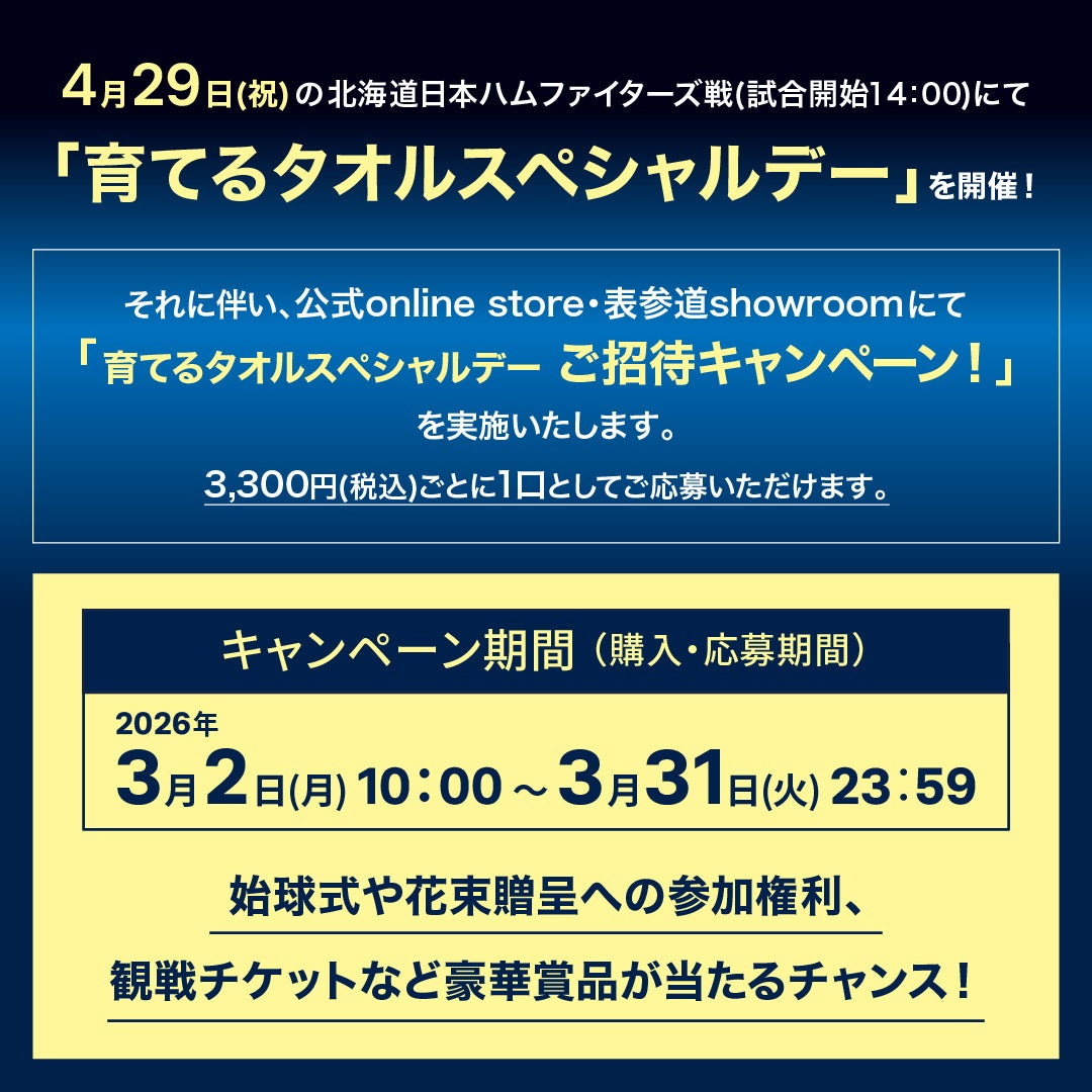 いずれの賞品も、4月29日(水・祝) の北海道日本ハムファイターズ戦「育てるタオルスペシャルデー」の試合のみが対象です。
