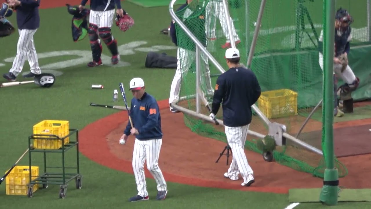 吉田正尚・村上宗隆・岡本和真が打撃練習をするなかバットを持ってオリックスベンチ裏へ消えて行った大谷翔平の現地映像です。
