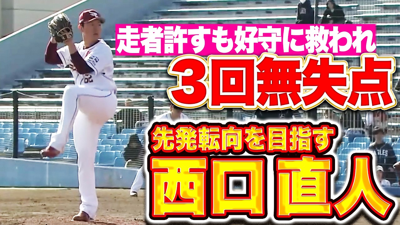 昨季は52試合登板と中継ぎでフル回転の活躍をみせた東北楽天・西口直人。今季は先発へ転向となり、勝ち星を重ねる活躍が期待される。6回に2番手で登板すると、2奪三振3者凡退!! 2イニング目はヒットに連続四球とピンチを背負う場面もあったが、後続を断ち無失点。3イニング目は先頭にヒットを許すも、味方の好守にも助けられ3回42球無失点の好投となった!!