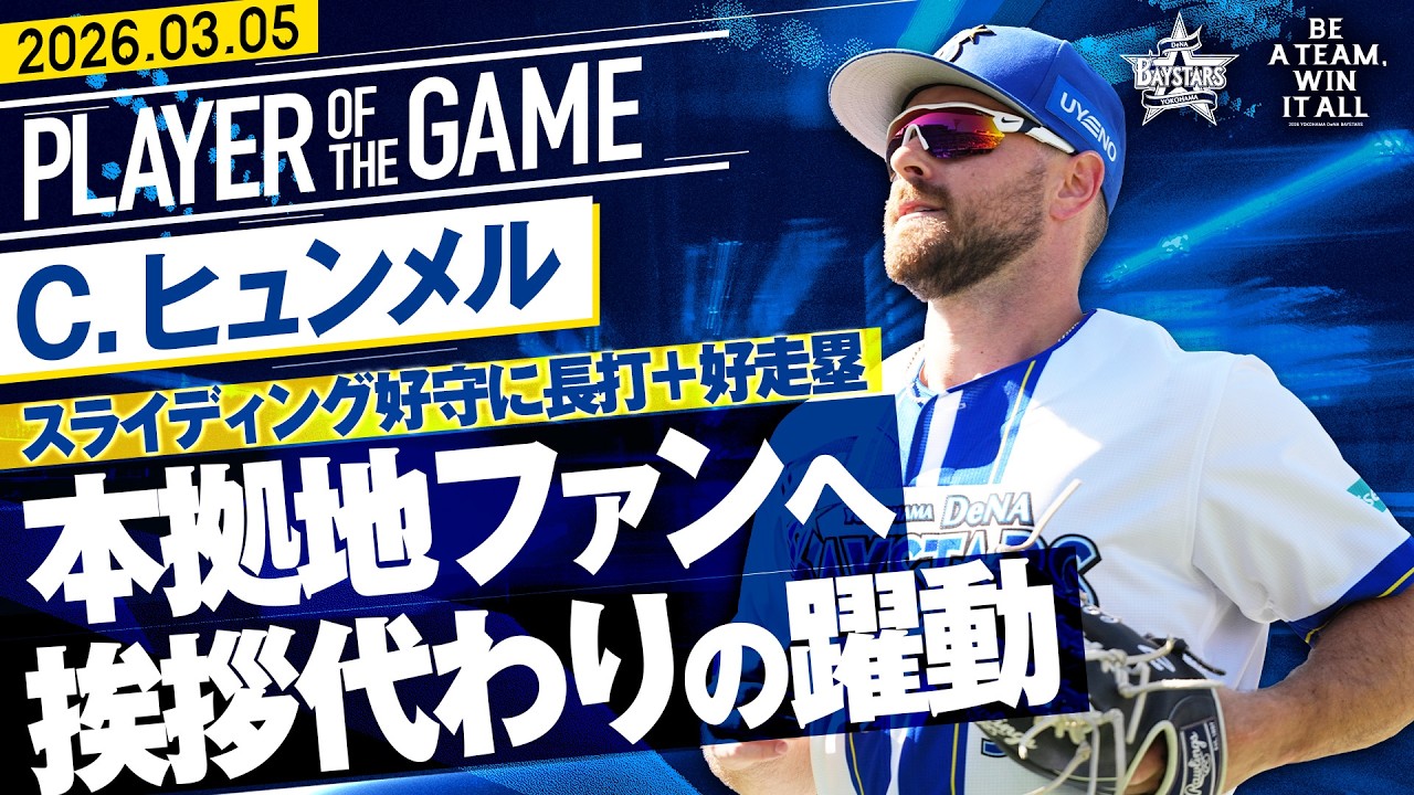 【攻守で魅せた】ヒュンメル『スライディング好守に長打+好走塁生還!本拠地ファンへ挨拶代わりの躍動!』|2026.3.5の注目シーン 新戦力の外国人・ヒュンメルが走攻守で魅せた!!! 3回、ショート後方への打球にスライディングキャッチで追いつき相手打線の流れを断つファインプレーを披露!! 4回にはライト線を破る2ベースヒットで長打力をみせると、レフト前への打球で一気に本塁へ!! タッチをうまくかわし勝ち越し点を奪った!! #ヒュンメル #走攻守で躍動 #期待の新戦力 #ベイスターズ #プロ野球baystarsDeNAYOKOHAMA DeNA BAYSTARSベイスターズ横浜横浜DeNAベイスターズ横浜スタジアム NPBHUB.COM | The Fanbase of Nippon Baseball & Nippon Professional Baseball