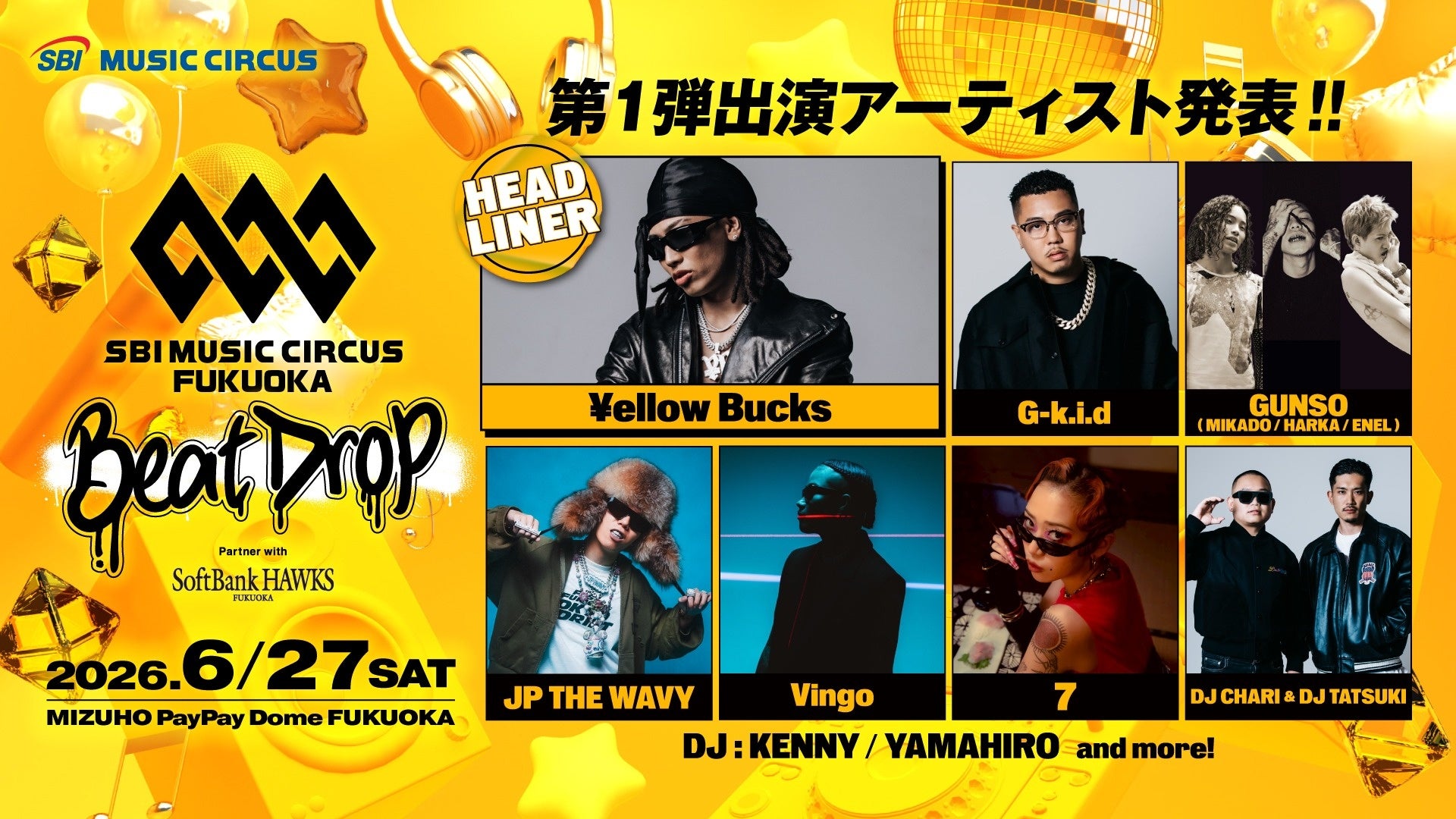 株式会社SBI MUSIC CIRCUS(本社:東京都港区、代表取締役社長:大付 楽洋、以下「当社」)は、福岡ソフトバンクホークス株式会社(本社:福岡市中央区、代表取締役社長CEO:後藤 芳光)と共催で、2026年6月27日(土)にみずほPayPayドーム福岡にて開催する「SBI MUSIC CIRCUS FUKUOKA -Beat Drop- partner with SoftBank HAWKS」の第1弾出演アーティストを発表しました。