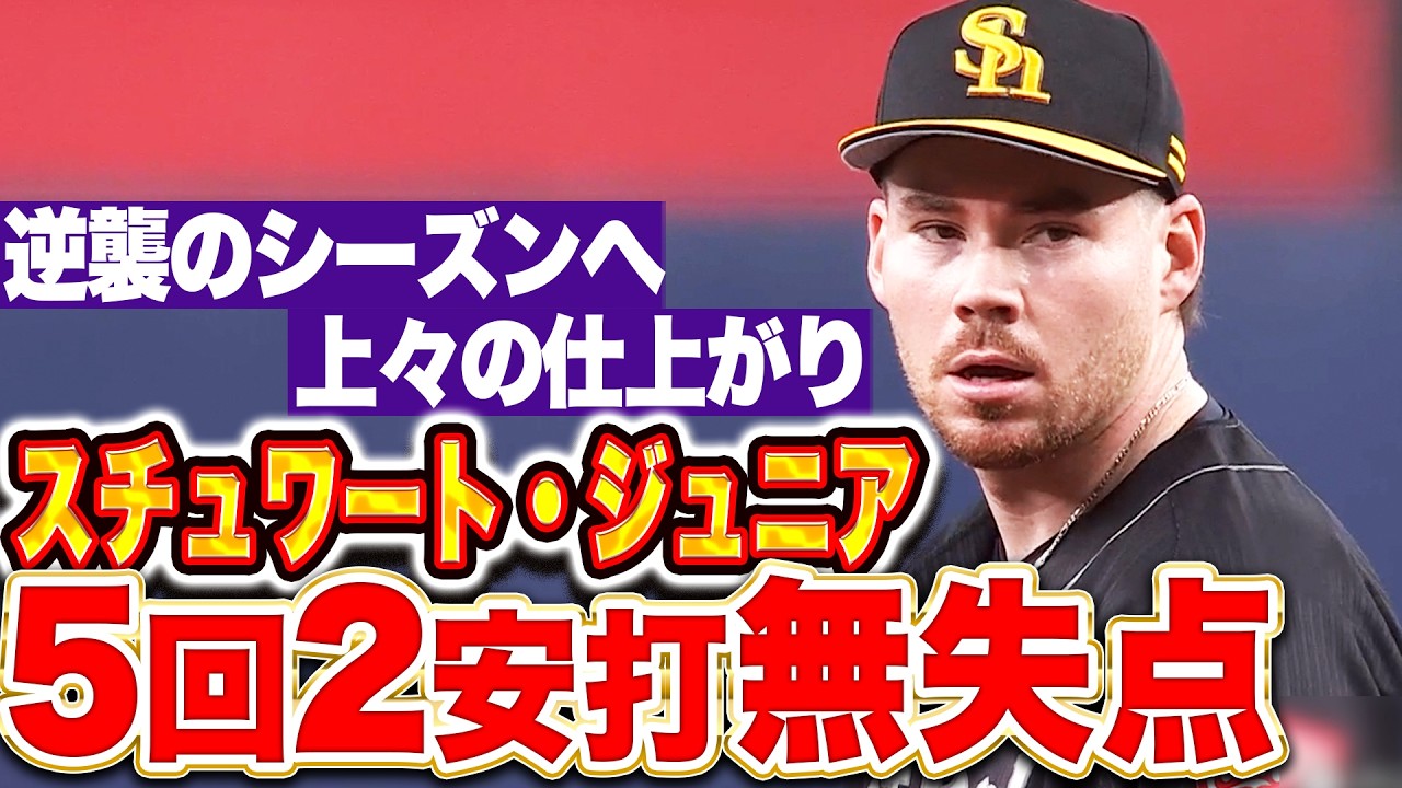 福岡ソフトバンクはスチュワート・ジュニアが先発。立ち上がりから安定感抜群の投球で、最大12者連続でアウトを奪う。5回には先頭に二塁打を許すが、落ち着いて後続3人を斬って取る!! 5回2安打無四球無失点と素晴らしい投球で、逆襲のシーズンに向けてエンジン全開!!