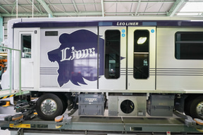 先頭車の先端部。反対側は「レオ」ではなく「Lions」ロゴ