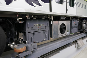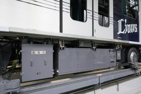 揺れが少なくなったボギー台車。ゴムのタイヤ。手前に張り出すのは集電装置