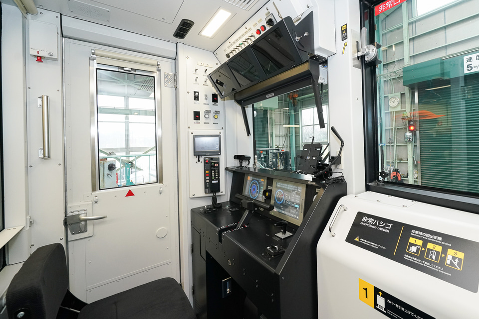 運転台には、速度計など表示する2連モニターと上に車側面カメラの映像を表示する3連モニターがある