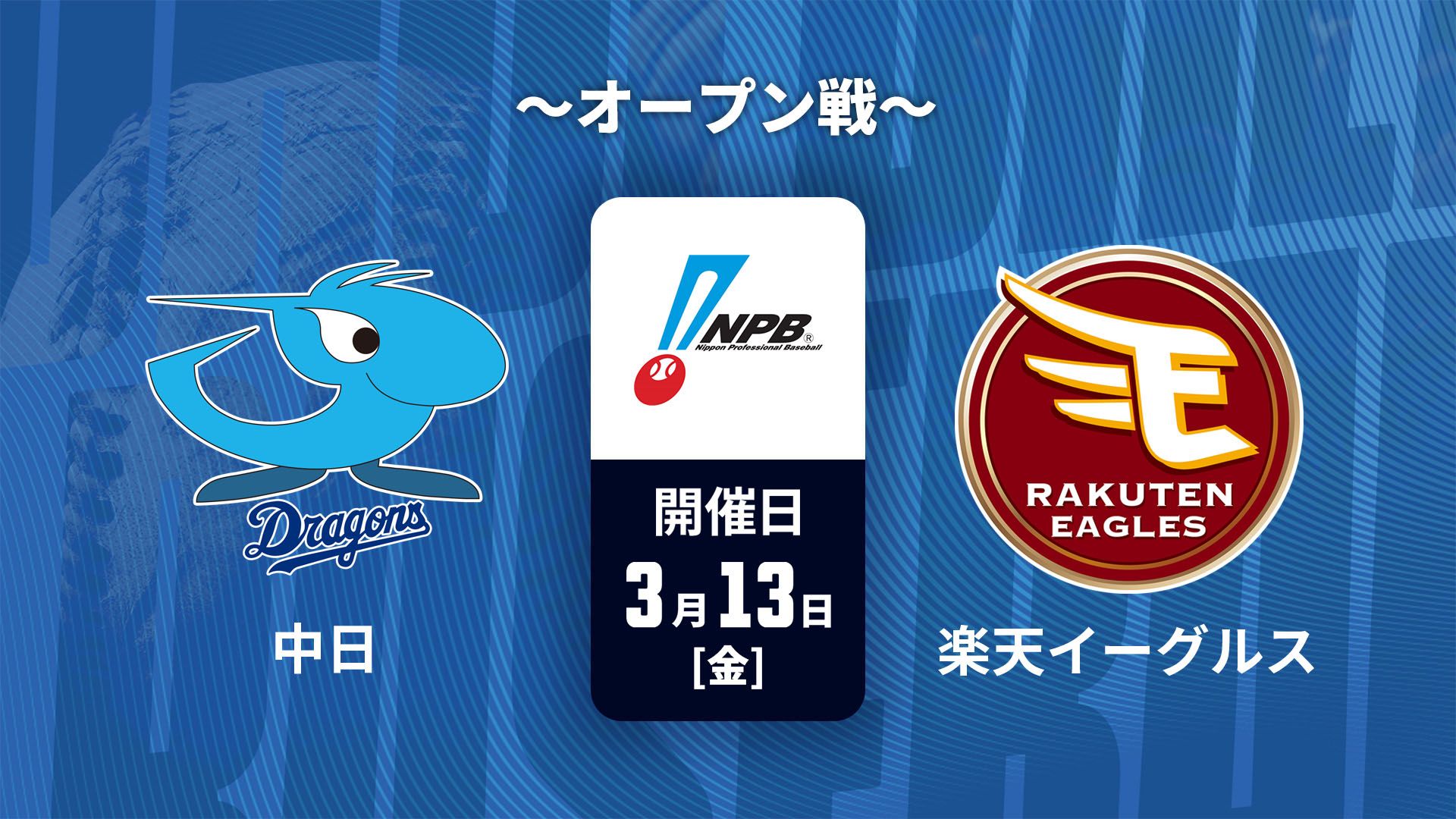 日程プレイボール時間対戦カード3/13(金)18:00中日ドラゴンズvs東北楽天ゴールデンイーグルス中日ドラゴンズvs東北楽天ゴールデンイーグルス|テレビ放送・ネット配信予定