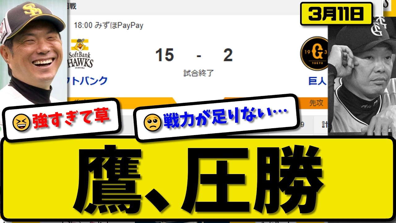 【オープン戦】ソフトバンクホークスが読売ジャイアンツに15-2で勝利…3月11日圧勝…先発大津4.1回2失点…今宮&山川&秋広&川瀬&野村&柳田が活躍【最新・なんJ・2ch】プロ野球