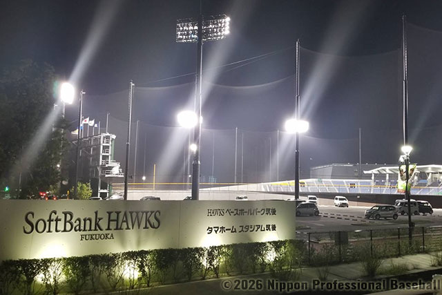 同所はJR九州新幹線の筑後船小屋駅前の筑後広域公園内に位置し、メイン球場のほか、サブ球場、屋内練習場、選手寮、クラブハウス、400台超収容の駐車場などを完備。ファームとしては球界屈指の規模を誇る練習施設で、将来の一軍を目指す二~四軍の若鷹たちが練習に励んでいます。