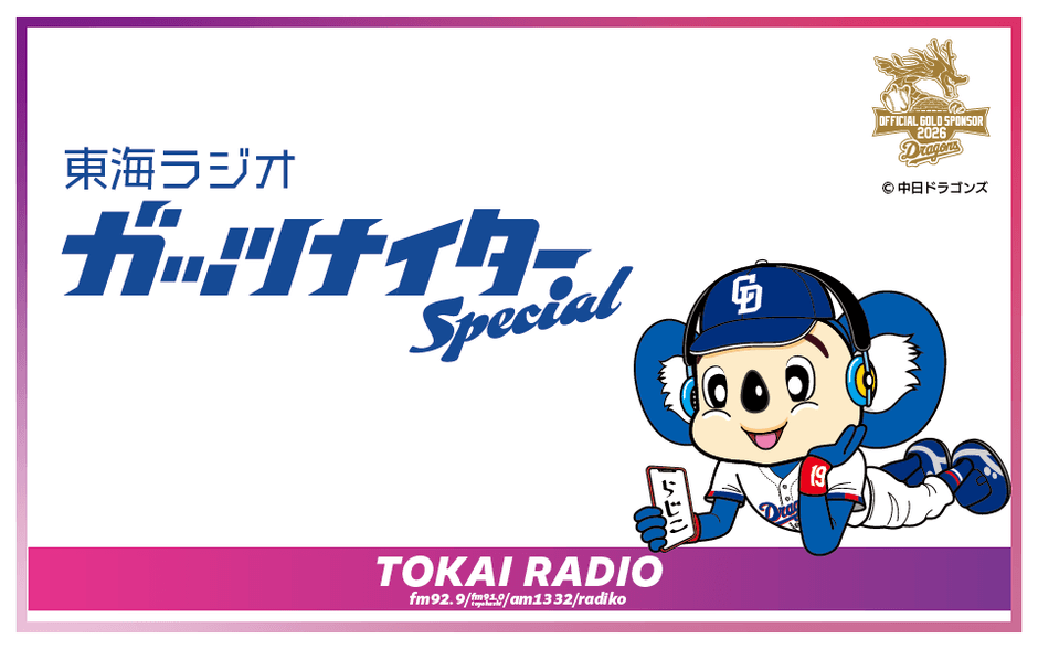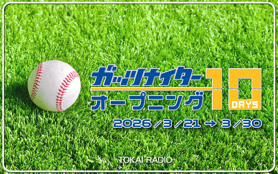 TOKAI RADIOは、3月21日(土)から3月30日(月)までの10日間、「TOKAI RADIO ガッツナイター オープニング10DAYS」を実施する。中日ドラゴンズのオープン戦 実況中継を皮切りに、「ガッツナイター」スタート前日までの10日間を盛り上げる。期間中は、昇竜ユニホームが配布される中日×DeNA戦の観戦チケットのプレゼントも実施する。