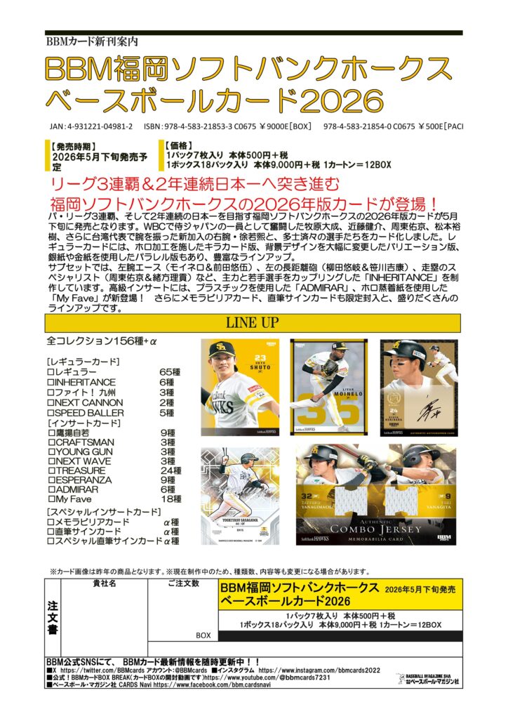 パ・リーグ3連覇、そして2年連続の日本一を目指す福岡ソフトバンクホークスの2026年版カードが5月下旬に発売となります。