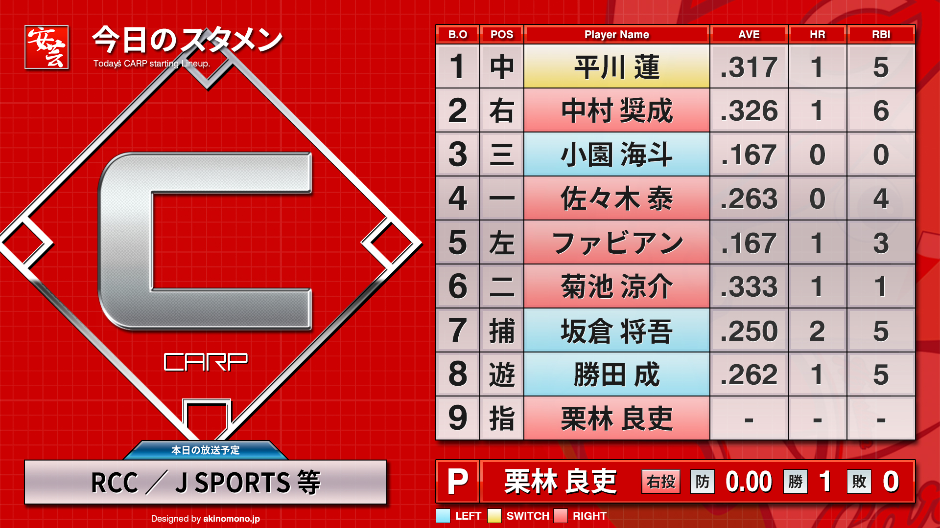 [先発]スチュワート・ジュニア【放送予定】地上波放送RCCテレビ[解説]佐々岡真司BS放送J SPORTS 1ネット配信J SPORTSオンデマンド