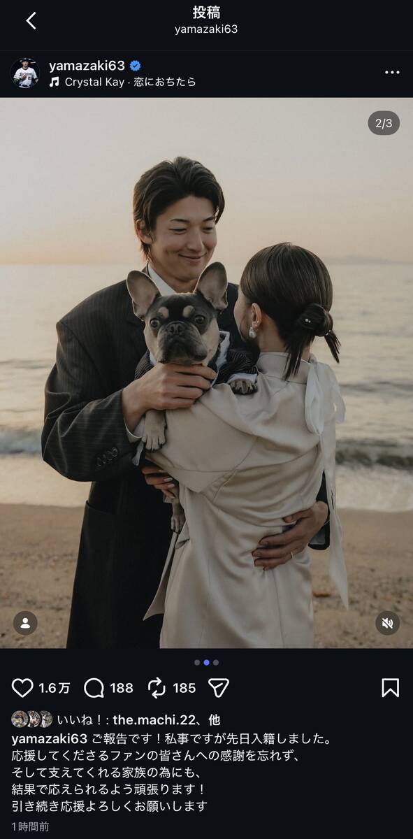 [Orix Buffaloes] Soichiro Yamazaki anuncia su matrimonio: “Nunca olvidaré mi gratitud a todos los fans”. Su pareja es una mujer un año mayor que él, que no es famosa. Lo anunció en su cuenta de Instagram.
